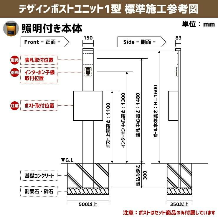 デザインポストユニット 1型 照明付き本体 P-1型ポスト セット 前入れ前出し