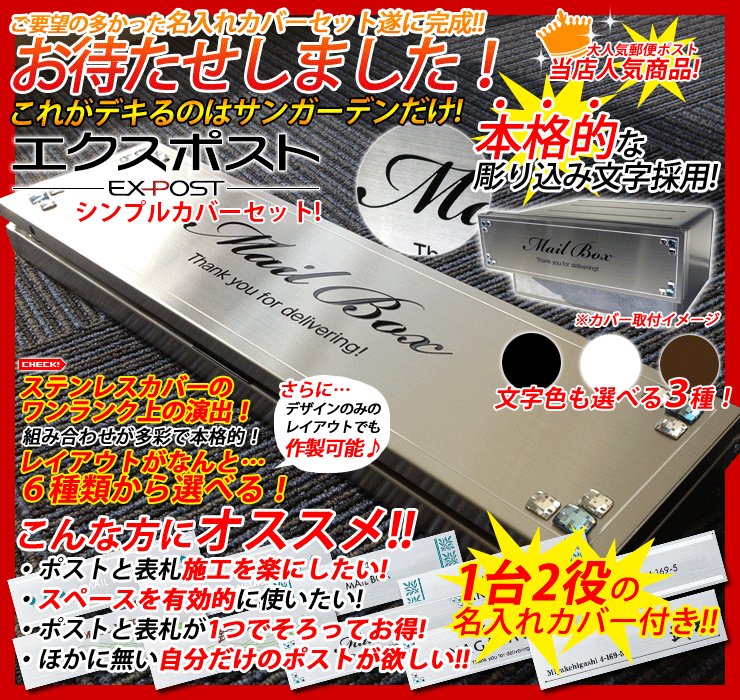 ![]() 壁付けポストSWE型ポストはシンプルでどこにでも合わせやすく、セキュリティ面も防犯性の高いプッシュ錠を搭載した三協アルミ(三協立山アルミ)の高機能壁付けポストです! こちらのSWEポストもお客様のお声をいただき名入れタイプが完成いたしました! シンプルなポストで名入れが欲しい方は必見! |