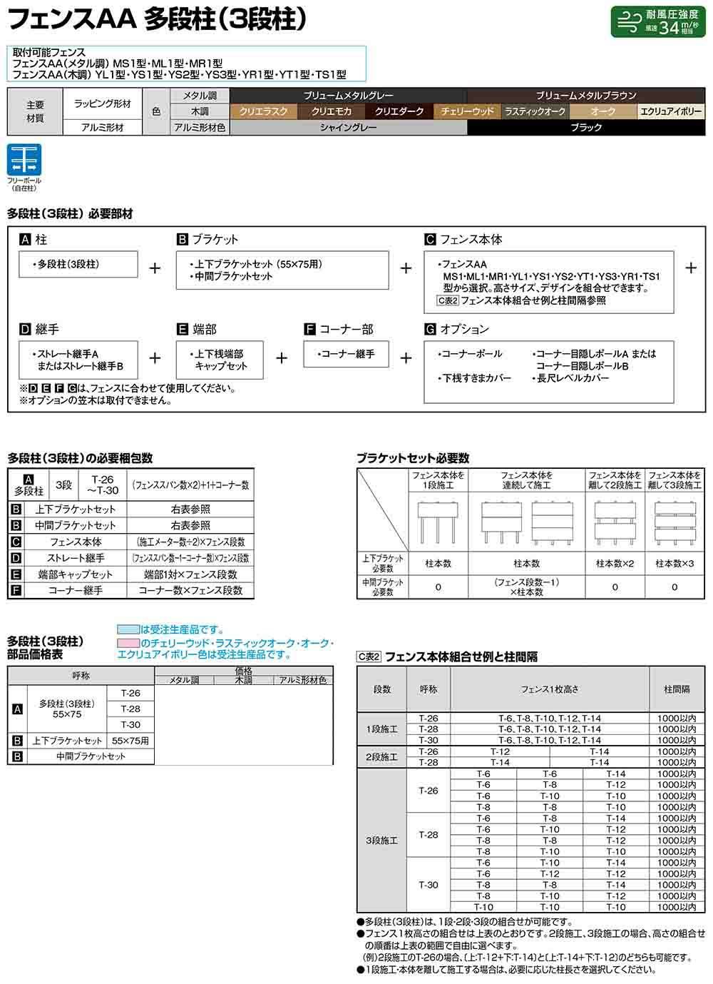 フェンスAA 多段柱(3段柱) 55×75 (T-28) アルミ色