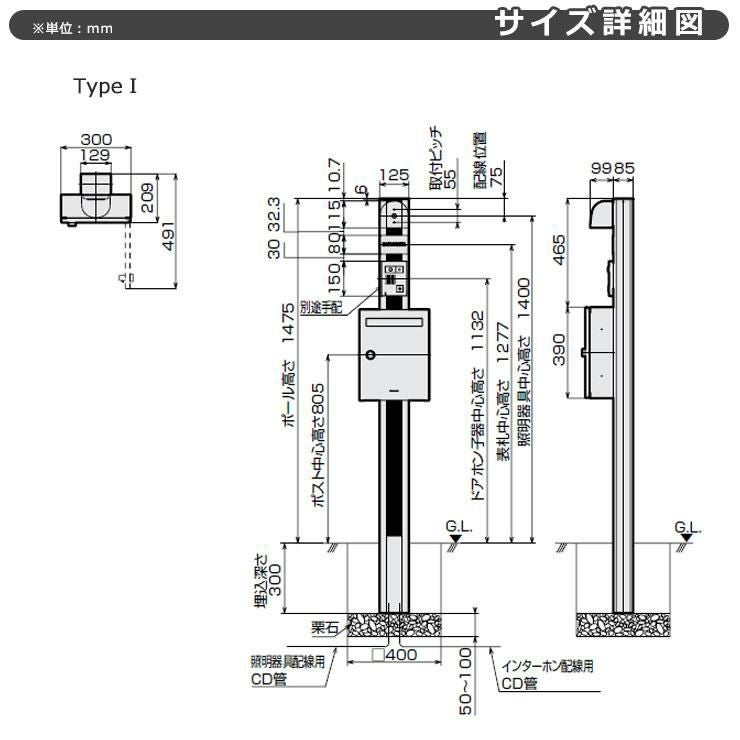 ポール本体+表札+ポスト(前入れ横出し・簡易錠仕様)