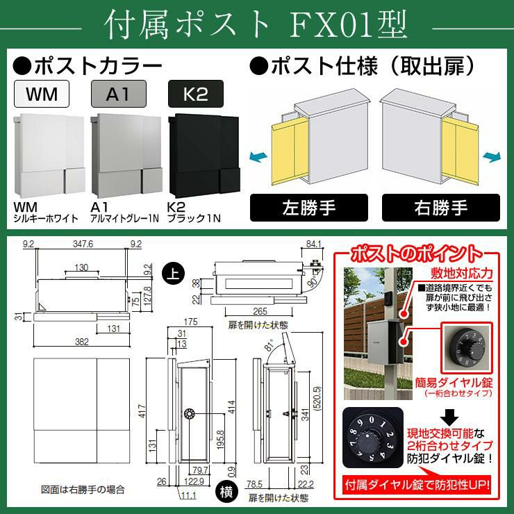 YKKap シンプレオポストユニット 1型 照明付き(100V照明)本体 FX01型ポスト(防犯錠) セット 上入れ横出し