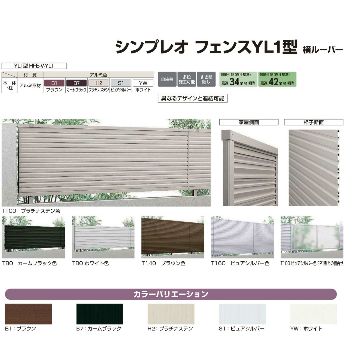 シンプレオフェンスYL1型 H1200タイプ(T120) 専用 ポール 自由柱+胴縁固定金具セット(耐風性能34m/秒相当)