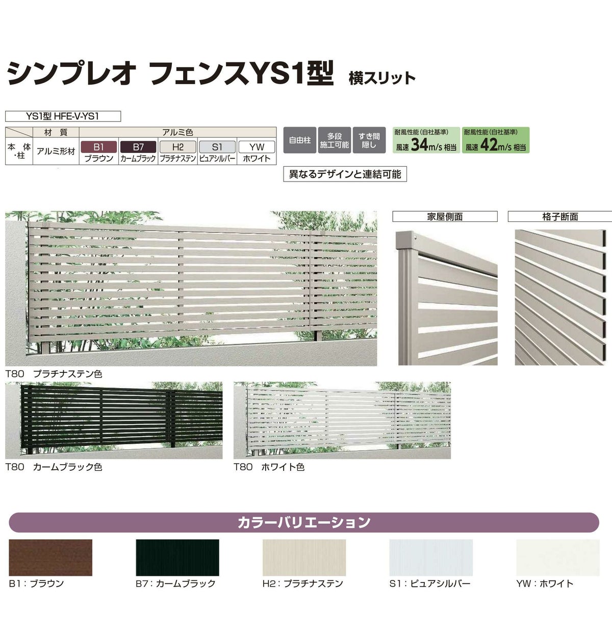 シンプレオフェンスYS1型 H1200タイプ(T120) 専用 ポール 自由柱+胴縁固定金具セット(耐風性能34m/秒相当)
