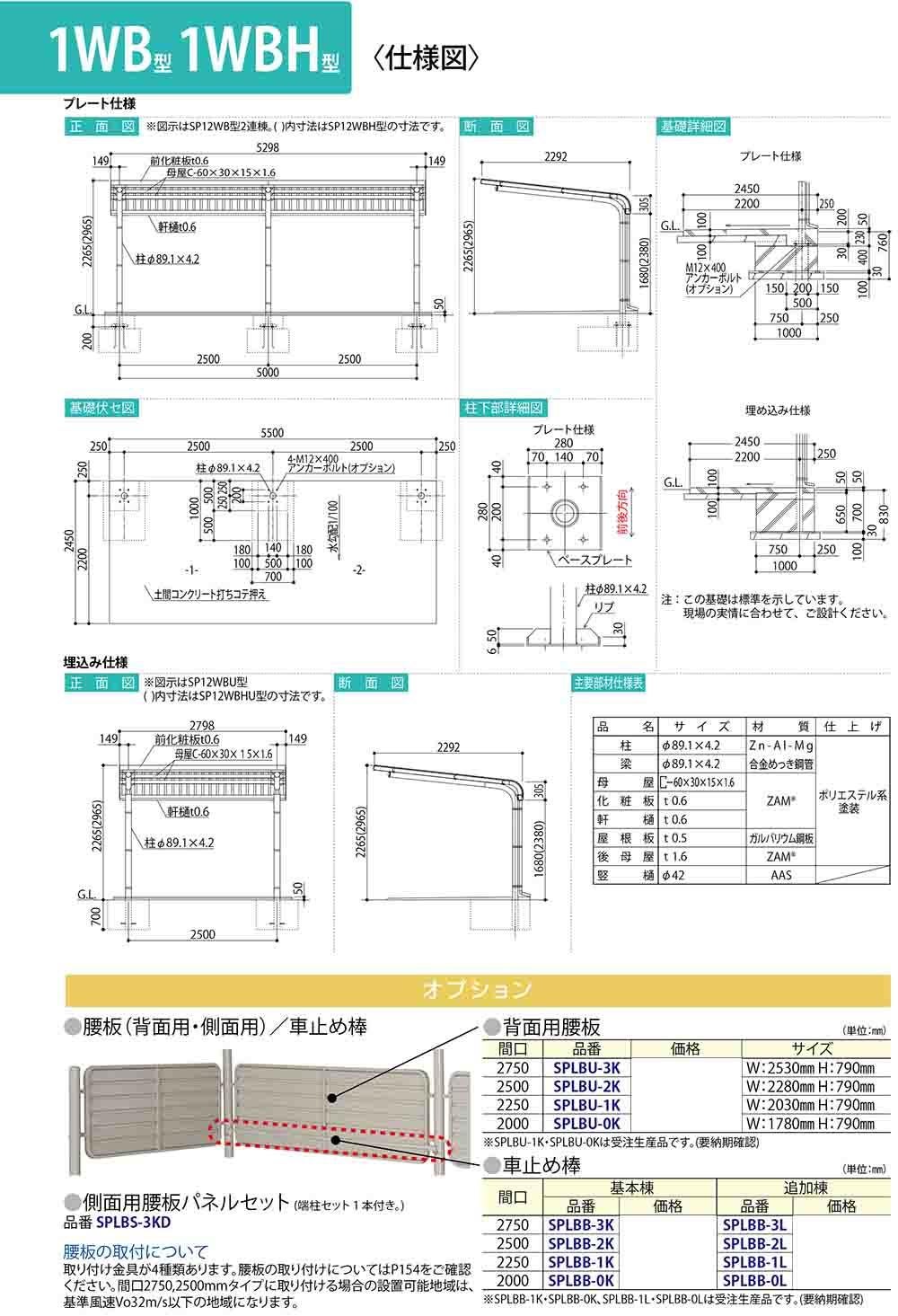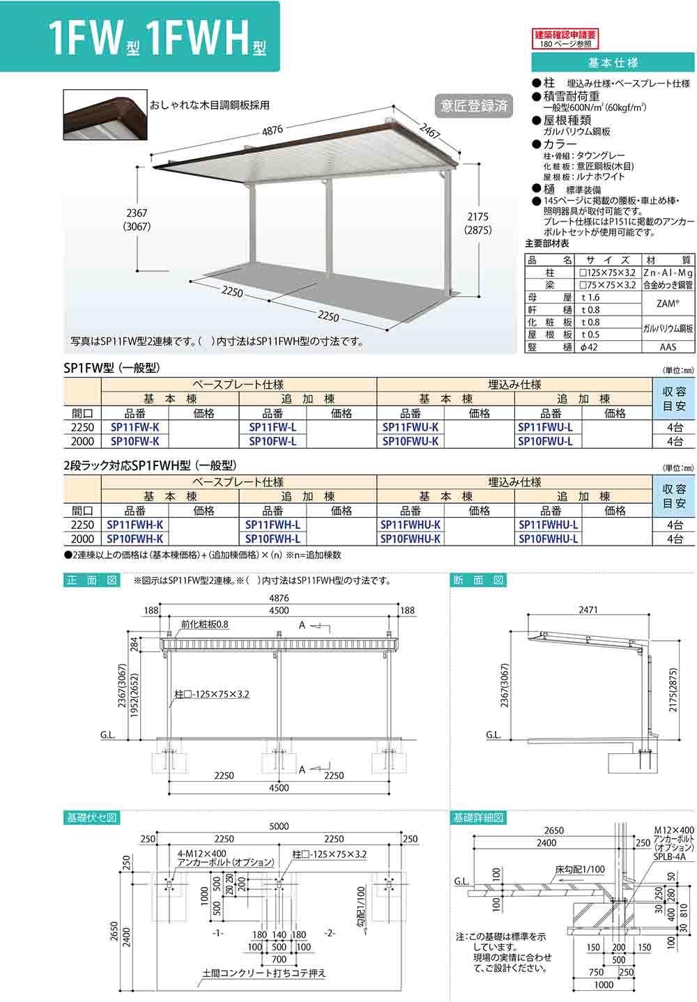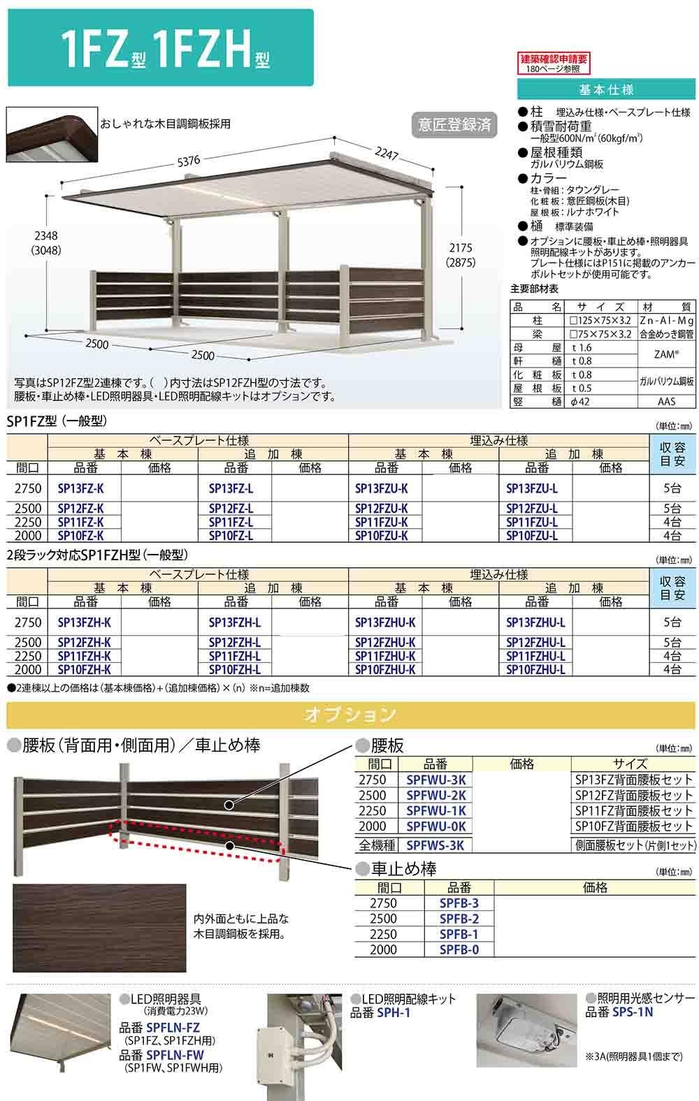 自転車置場上屋 SP1WBU型 SP11WBU-L 埋込み仕様 追加棟 収容目安4台 一般型 間口2250×奥行2301×高さ2265