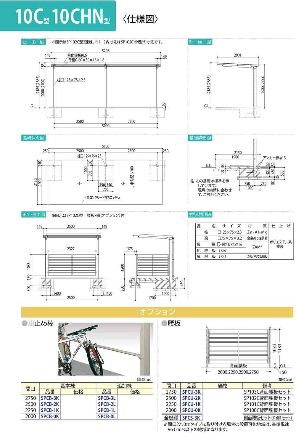 自転車置場上屋 SP10C型 SP101C-K 埋込み仕様 基本棟 収容目安4台 一般型 間口2250×奥行2001×高さ2185
