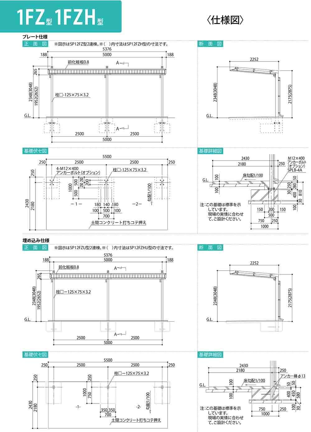 自転車置場上屋 SP1GTNA型 (腰板1段) SP12GTNA-LN 埋込み仕様 追加棟 (たて樋なし) 収容目安5台 一般型 間口2450×奥行2529×高さ2241