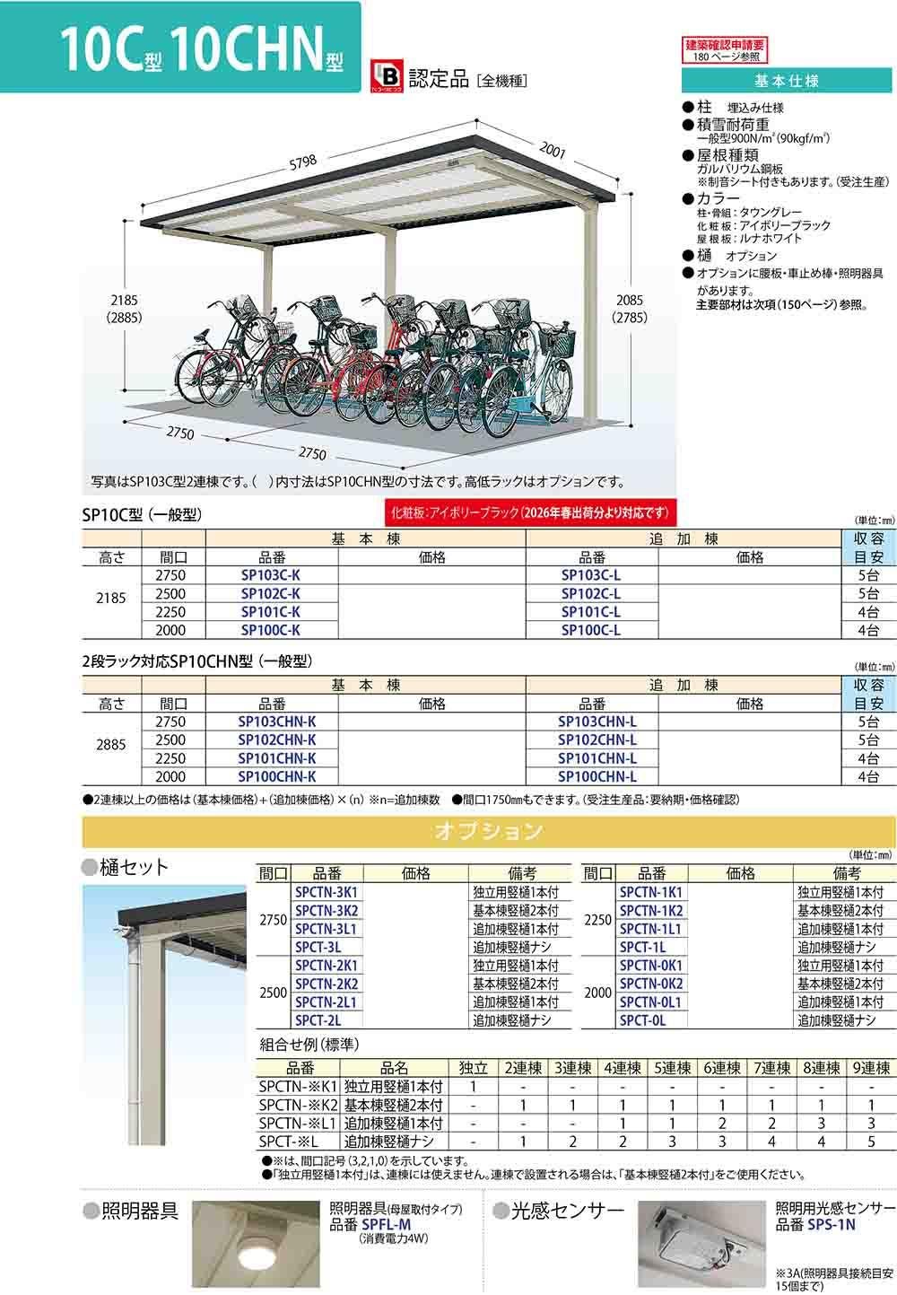 自転車置場上屋 SP10CHN型 (2段ラック) SP103CHN-L 埋込み仕様 追加棟 収容目安5台 一般型 間口2750×奥行2001×高さ2885