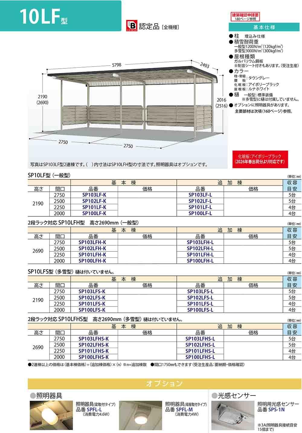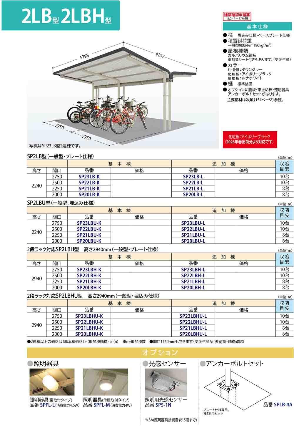 自転車置場上屋 SP1LBU型 SP10LBU-L 埋込み仕様 追加棟 収容目安4台 一般型 間口2000×奥行2071×高さ2240