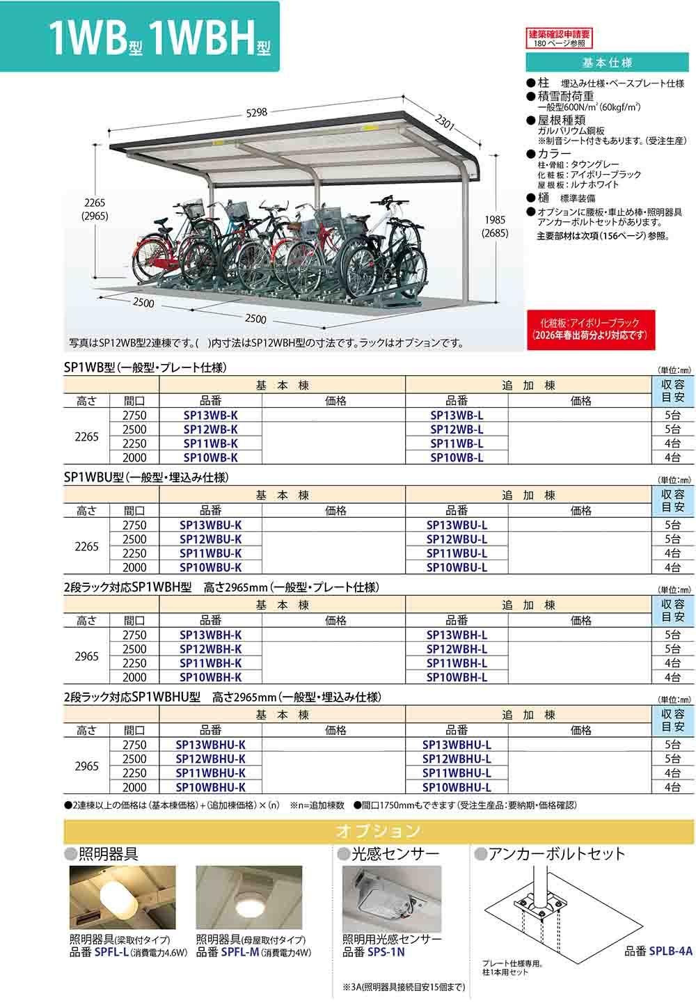 自転車置場上屋 SP1WBU型 SP10WBU-L 埋込み仕様 追加棟 収容目安4台 一般型 間口2000×奥行2301×高さ2265