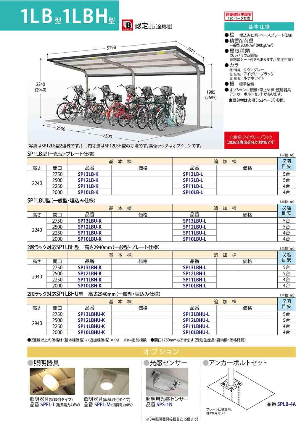 自転車置場上屋 SP1LBU型 SP13LBU-L 埋込み仕様 追加棟 収容目安5台 一般型 間口2750×奥行2071×高さ2240