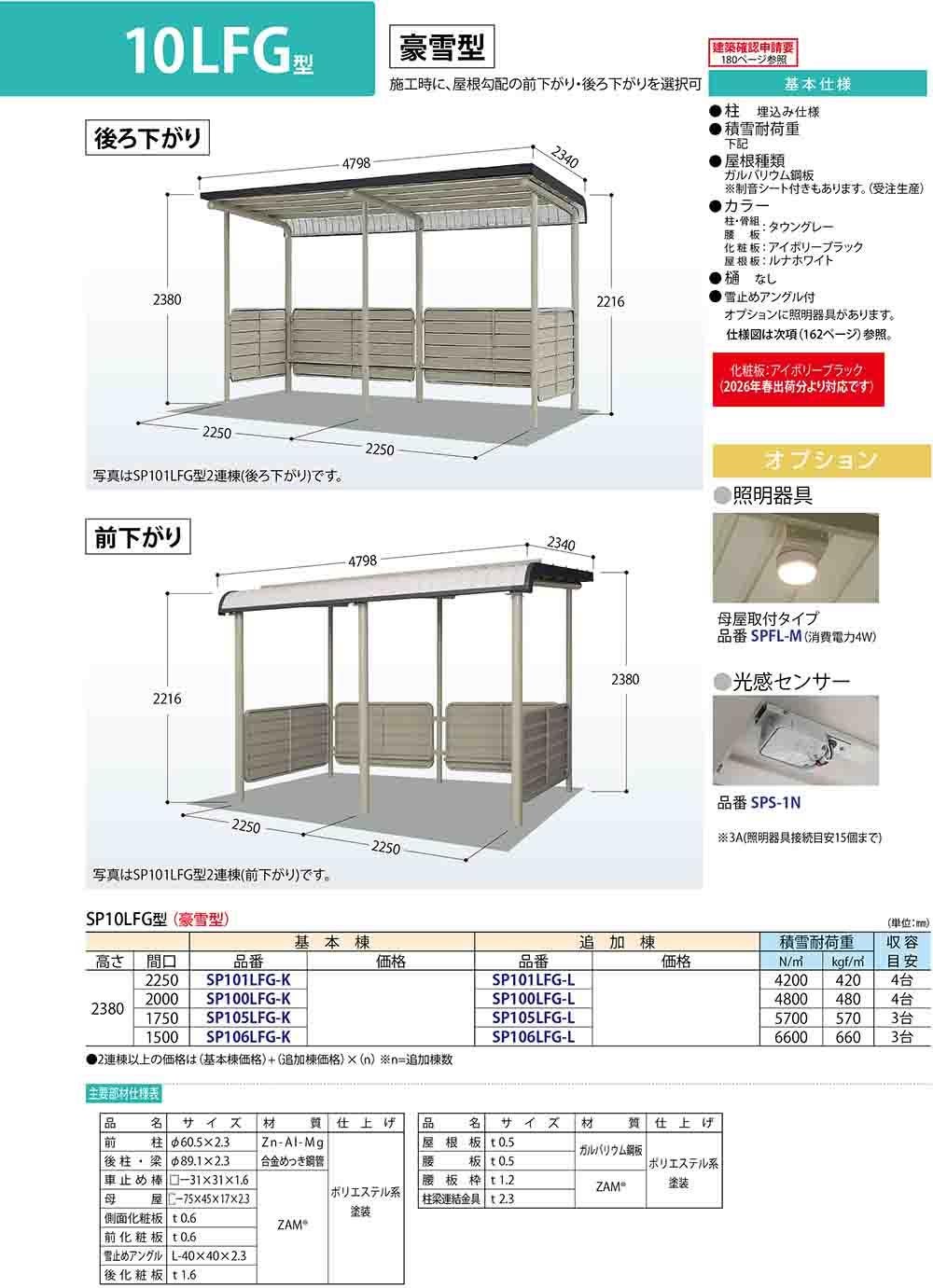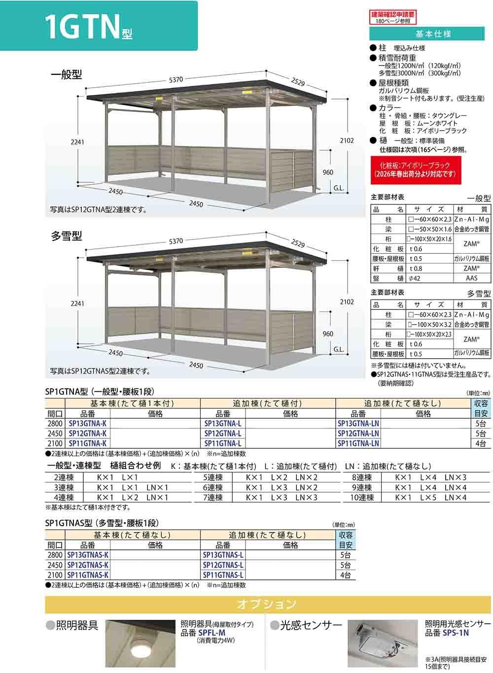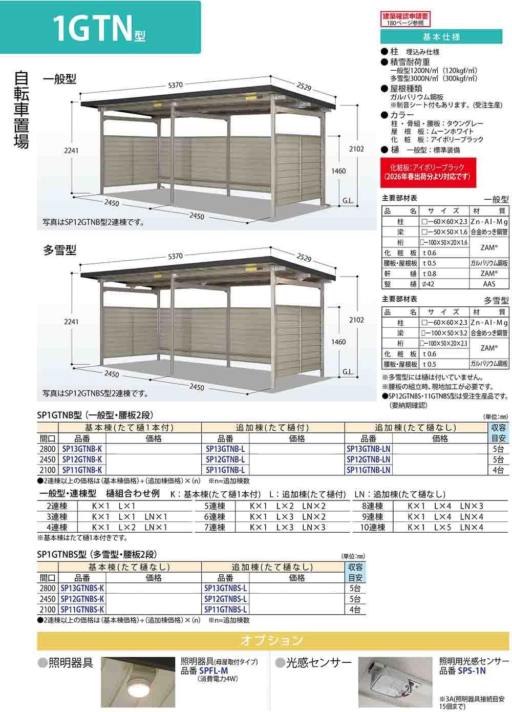 自転車置場上屋 SP1GTNA型 (腰板1段) SP11GTNA-LN 埋込み仕様 追加棟 (たて樋なし) 収容目安4台 一般型 間口2100×奥行2529×高さ2241