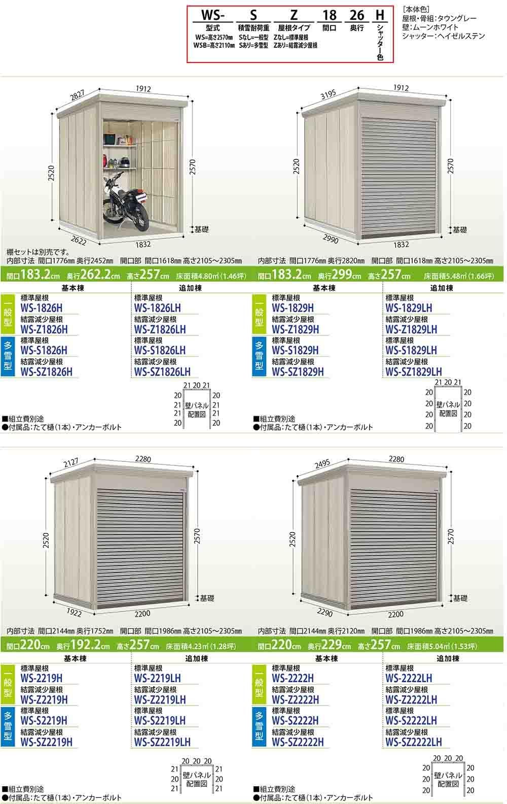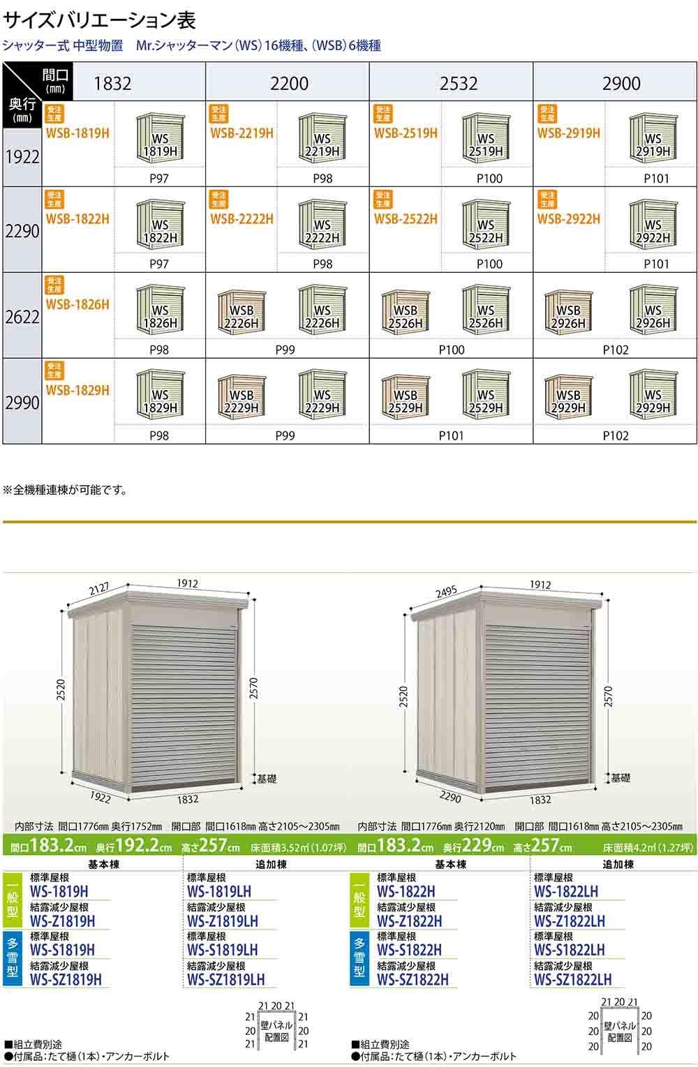 Mr.シャッターマン ダンディ 中型物置 WS-S1819H 標準屋根 基本棟 多雪型 間口1832×奥行1922×高さ2570