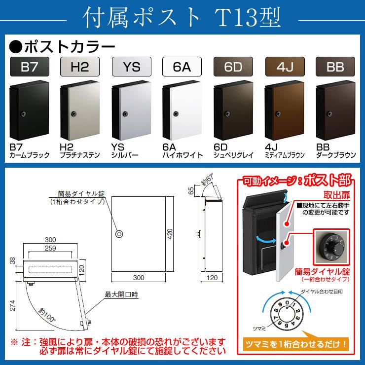 デザインポストユニット 1型 照明なし本体 T13型ポスト(簡易錠) セット 上入れ前出し