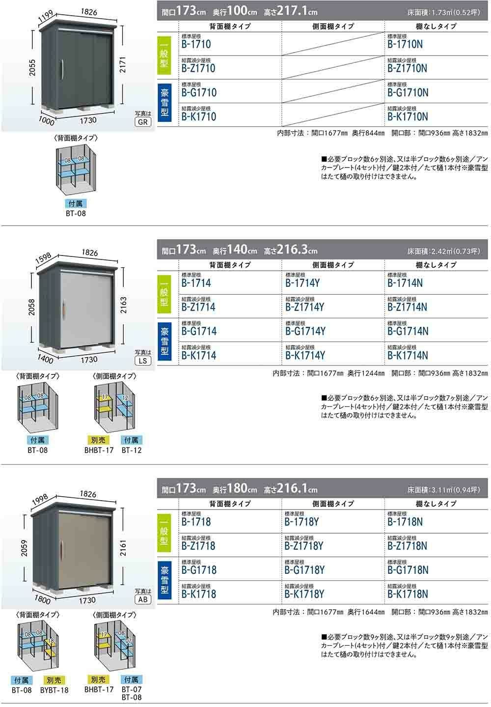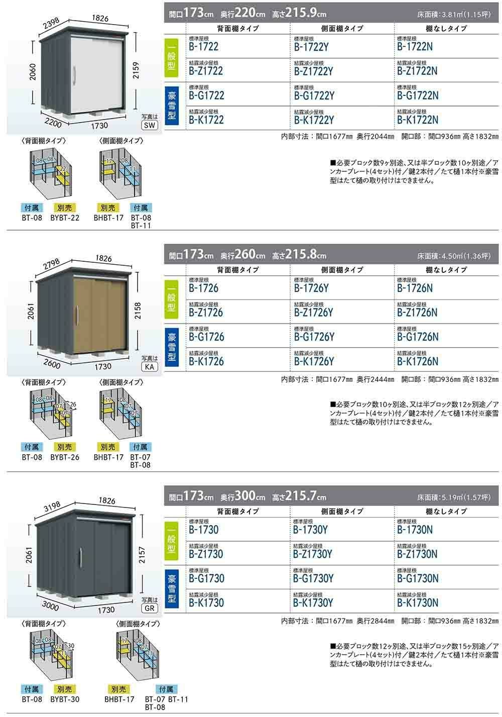 BELOS ヴェロス 中・大型物置 B-G1730 標準屋根 背面棚タイプ 豪雪型 間口1730×奥行3000×高さ2157