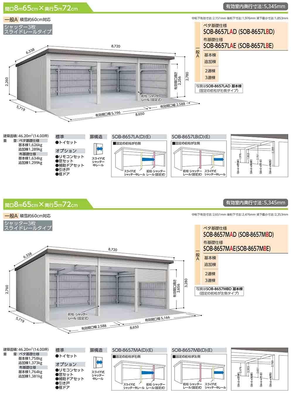 ヨド倉庫 SOB-8657MBD ベタ基礎仕様 追加棟 固定の前柱が左側 一般A 間口8650×奥行5719×高さ3280