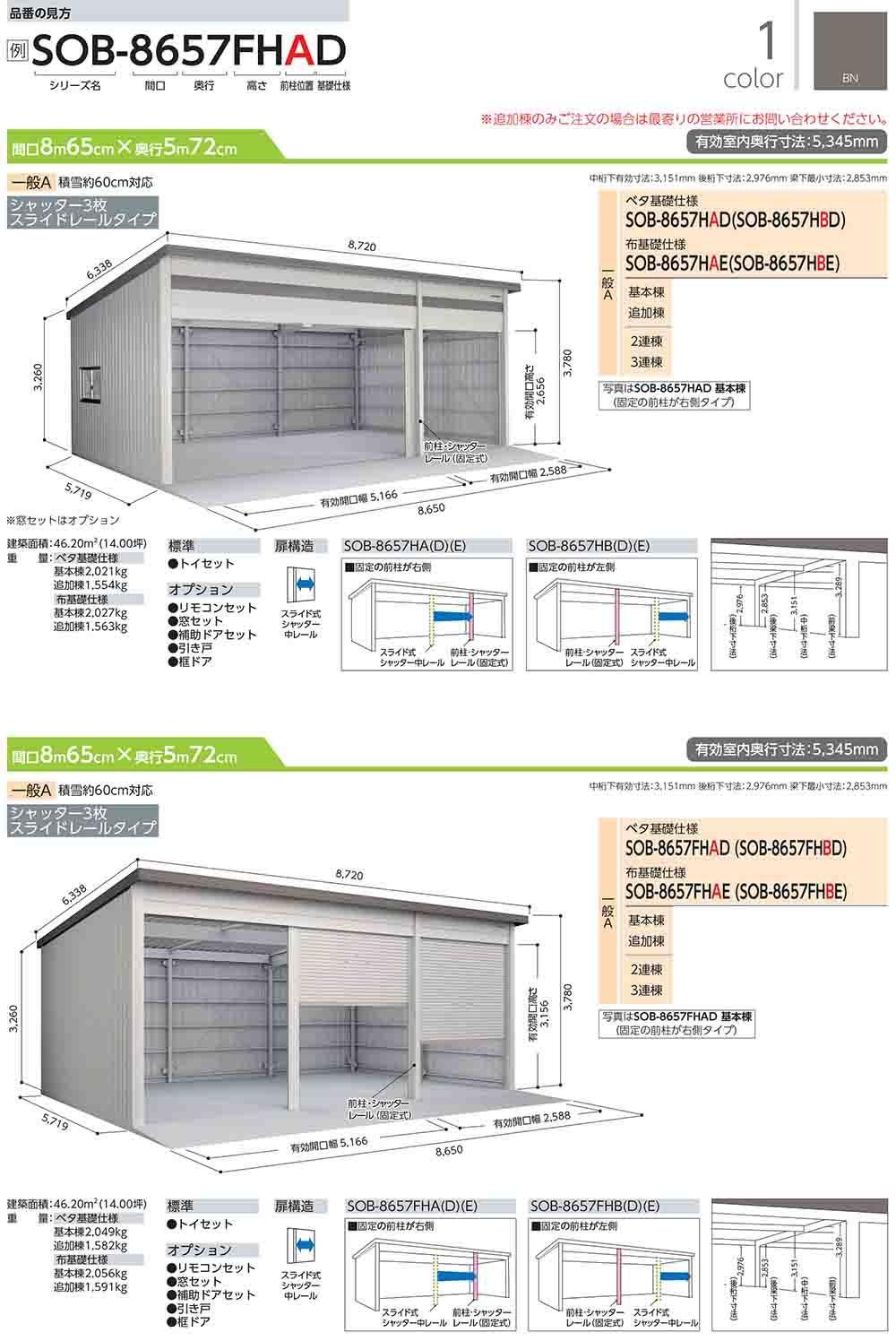 ヨド倉庫 SOB-8657FHBD ベタ基礎仕様 追加棟 固定の前柱が左側 一般A 間口8650×奥行5719×高さ3780