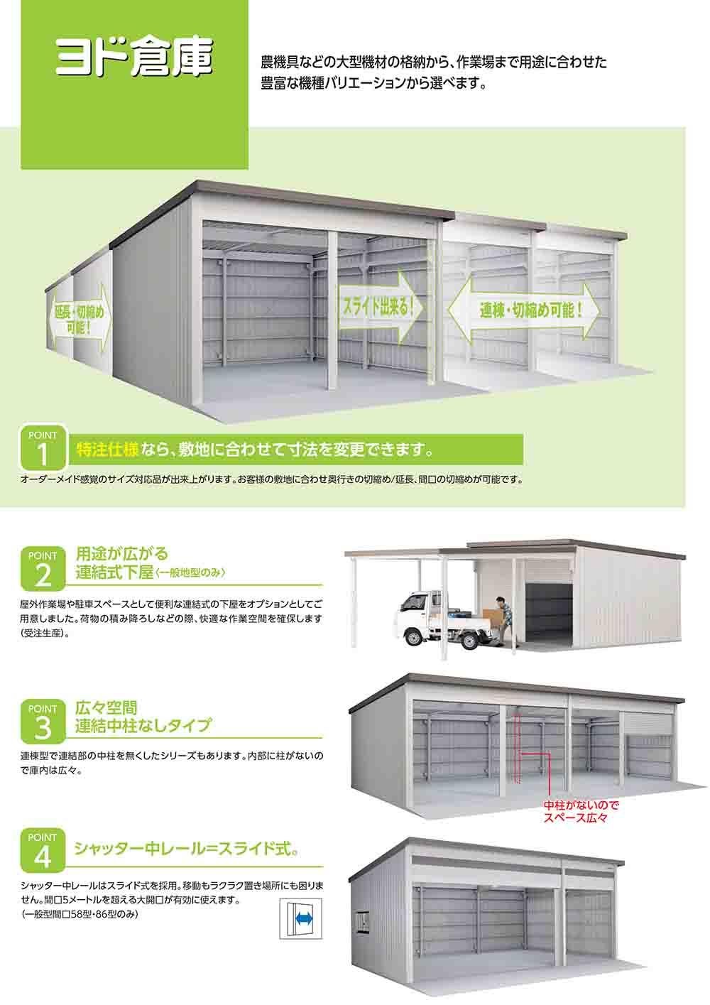 【YODOKO正規取扱店】農機具などの大型機材の格納から、作業場まで用途に合わせた豊富な機種バリエーションから選べます。万全のサビ対策。鋼板メーカーヨドコウのこだわりです。