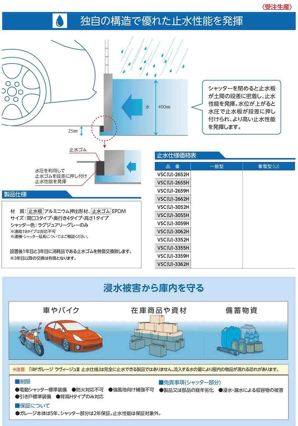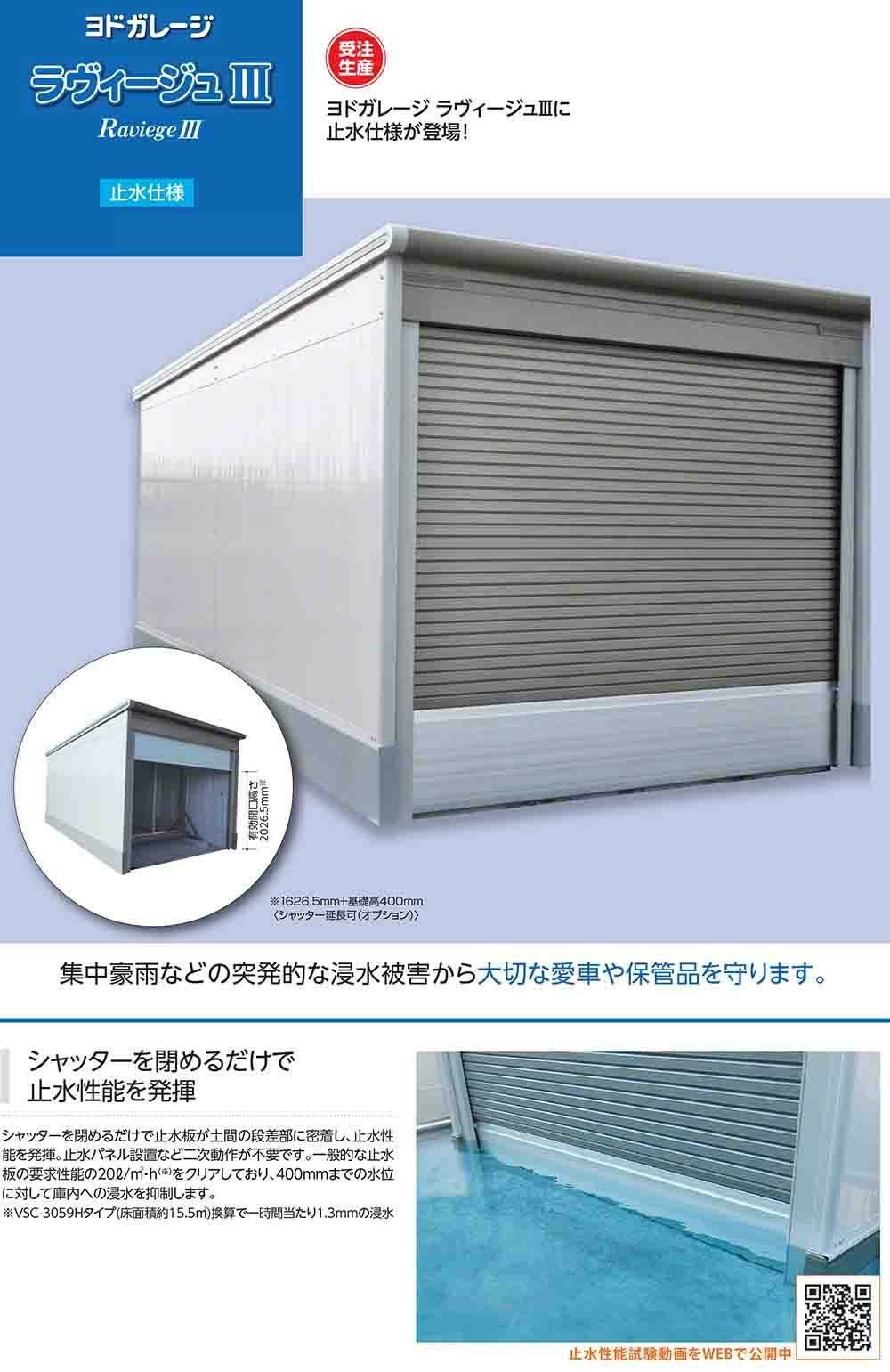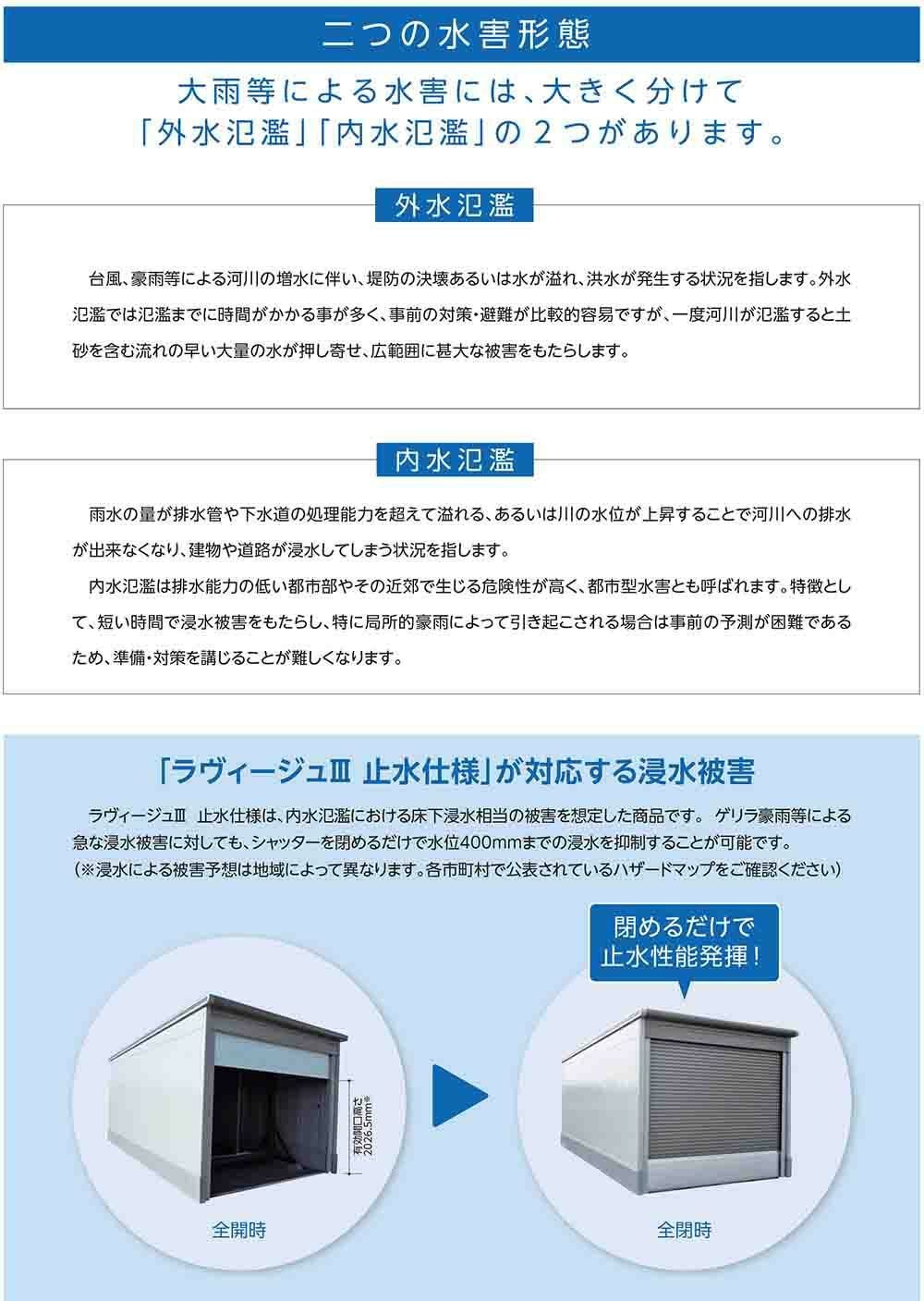 【YODOKO正規取扱店】ヨドガレージ ラヴィージュ3に止水仕様が登場!集中豪雨などの突発的な浸水被害から大切な愛車や保管品を守ります。シャッターを閉めるだけで止水性能を発揮!