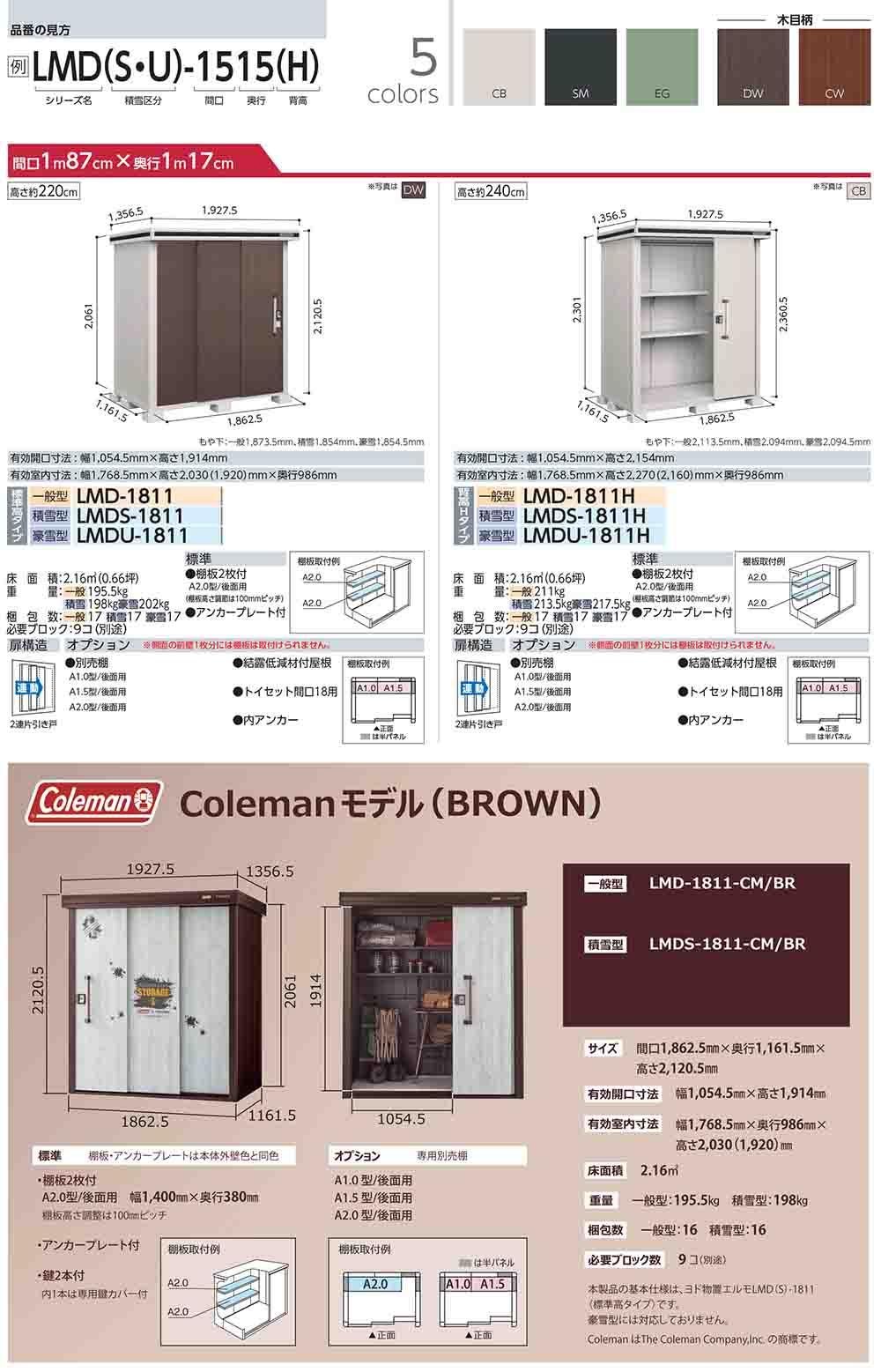 エルモ 中・大型物置 LMDS-1811H 2連片引き戸 背高Hタイプ 積雪型 間口1863×奥行1162×高さ2361