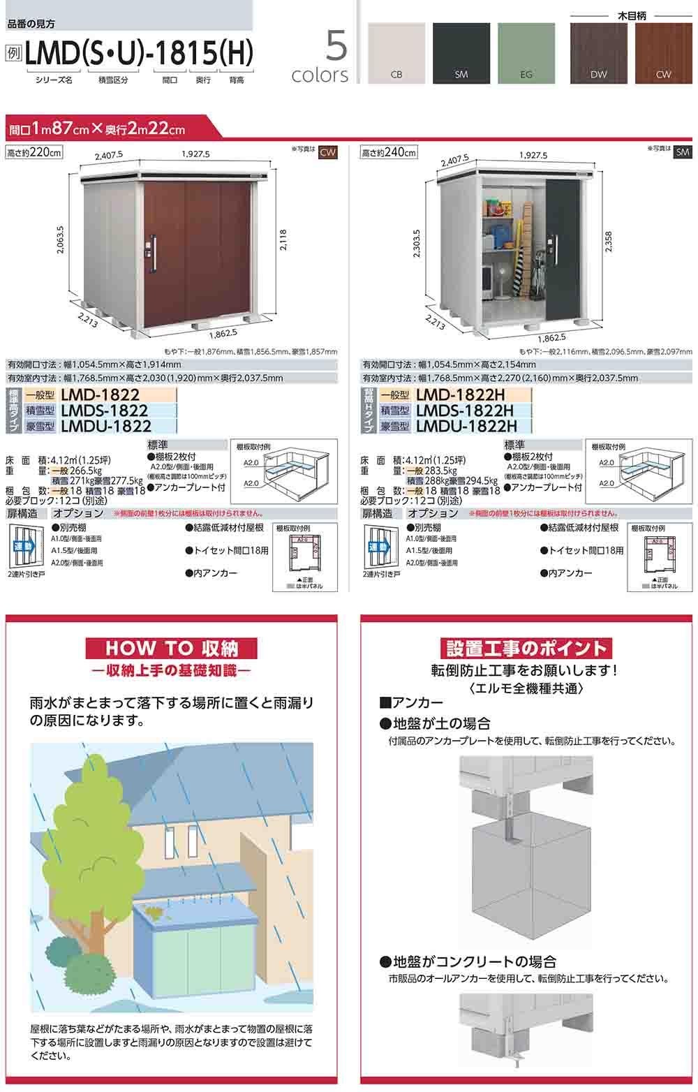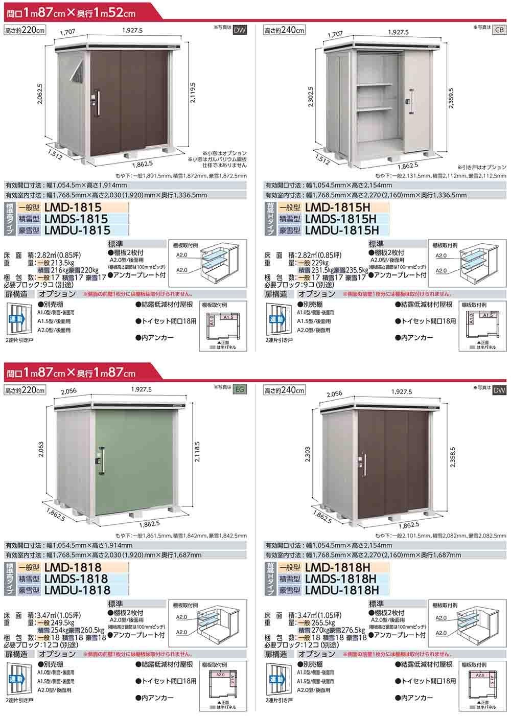 エルモ 中・大型物置 LMDS-1822H 2連片引き戸 背高Hタイプ 積雪型 間口1863×奥行2213×高さ2358